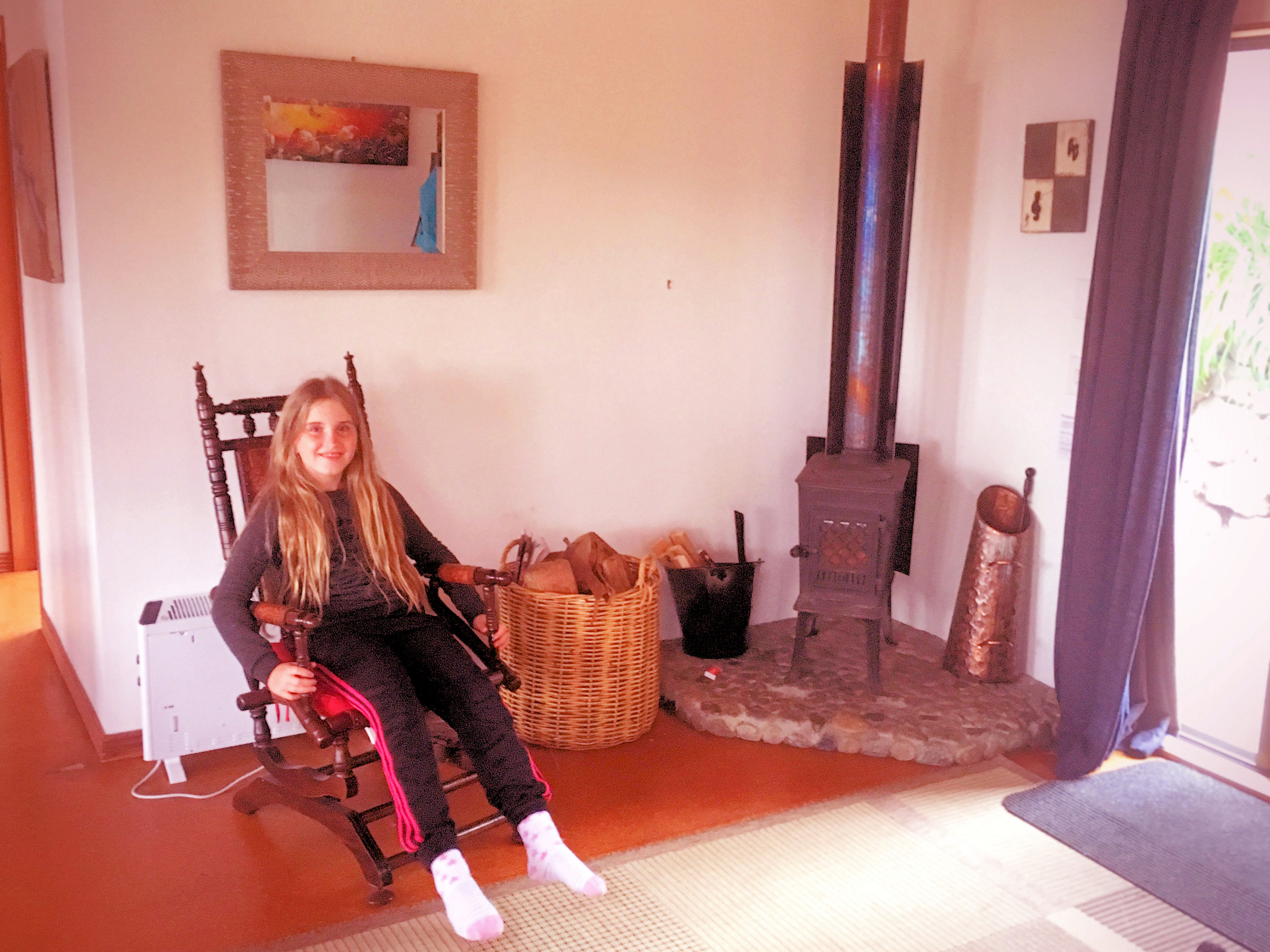 Zoe bij de kachel. Dat kleine krengetje (de kachel, niet Zoe) kon de boel goed opstoken!