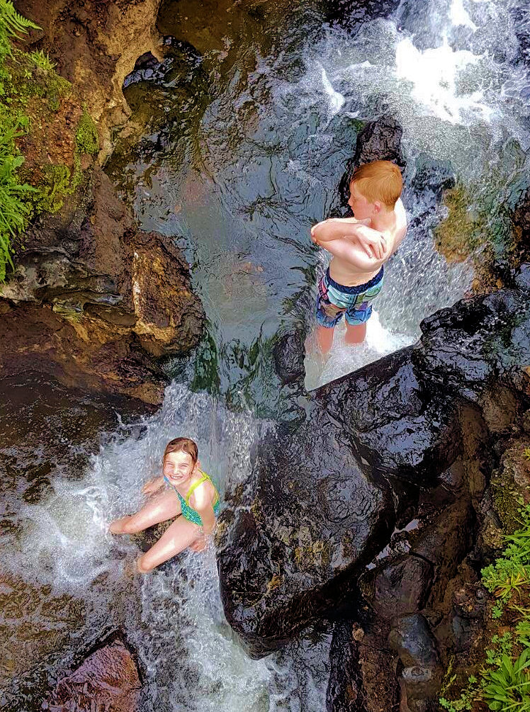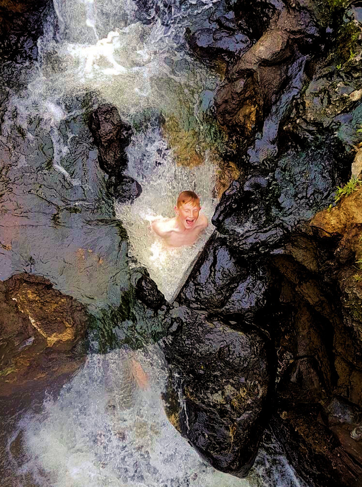 En eindelijk hebben we dan tijd om ons onder te dompelen in die warme waterbronnen! Wat is het toch heerlijk. Deze stinken iets minder dan die in Rotorua en dat maakt het iets prettiger om in te zijn. De waterval waar je Spyker onder ziet staan was zo warm dat het zelfs bijna te warm was! Maar een zeurpiet wie daarover klaagt.