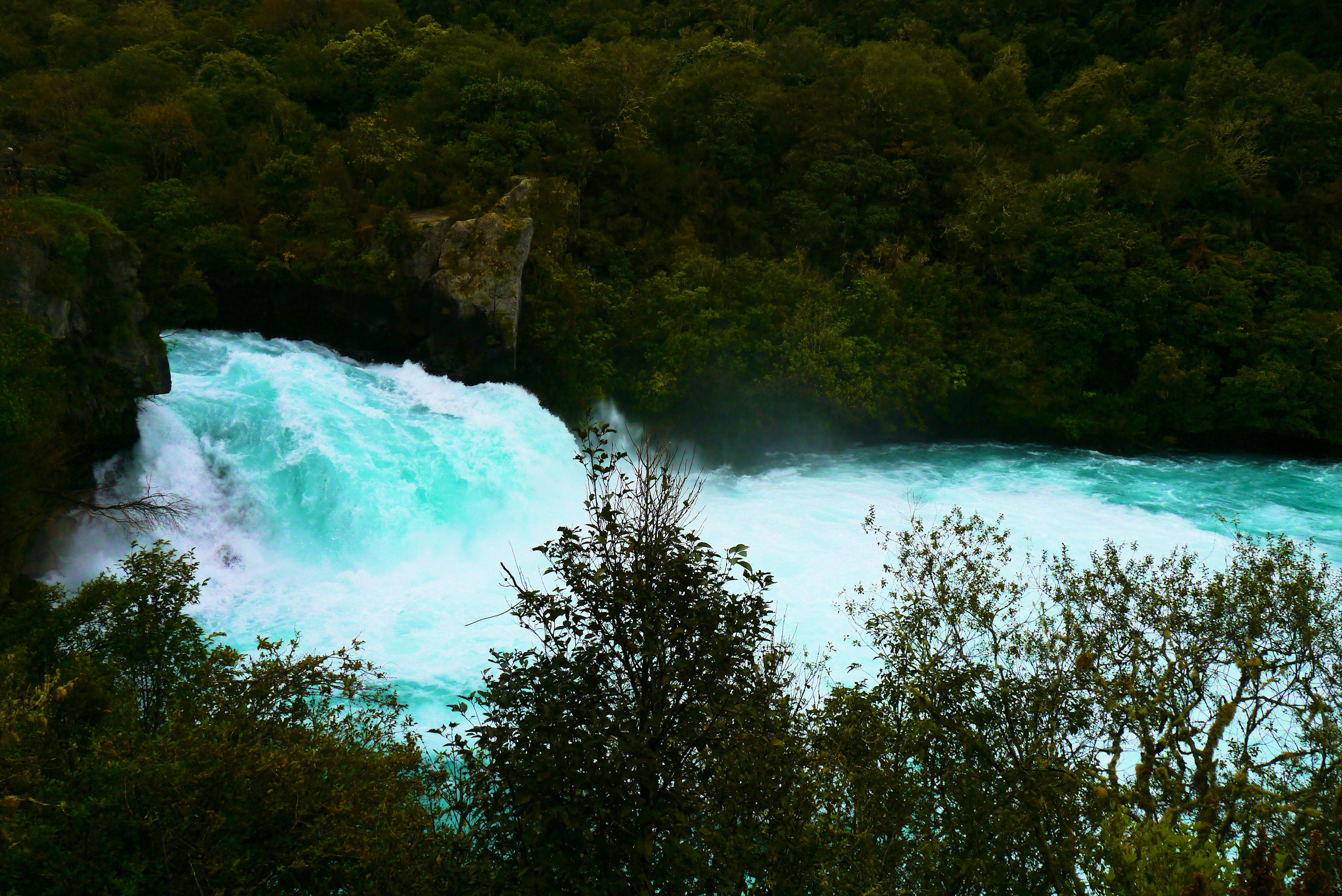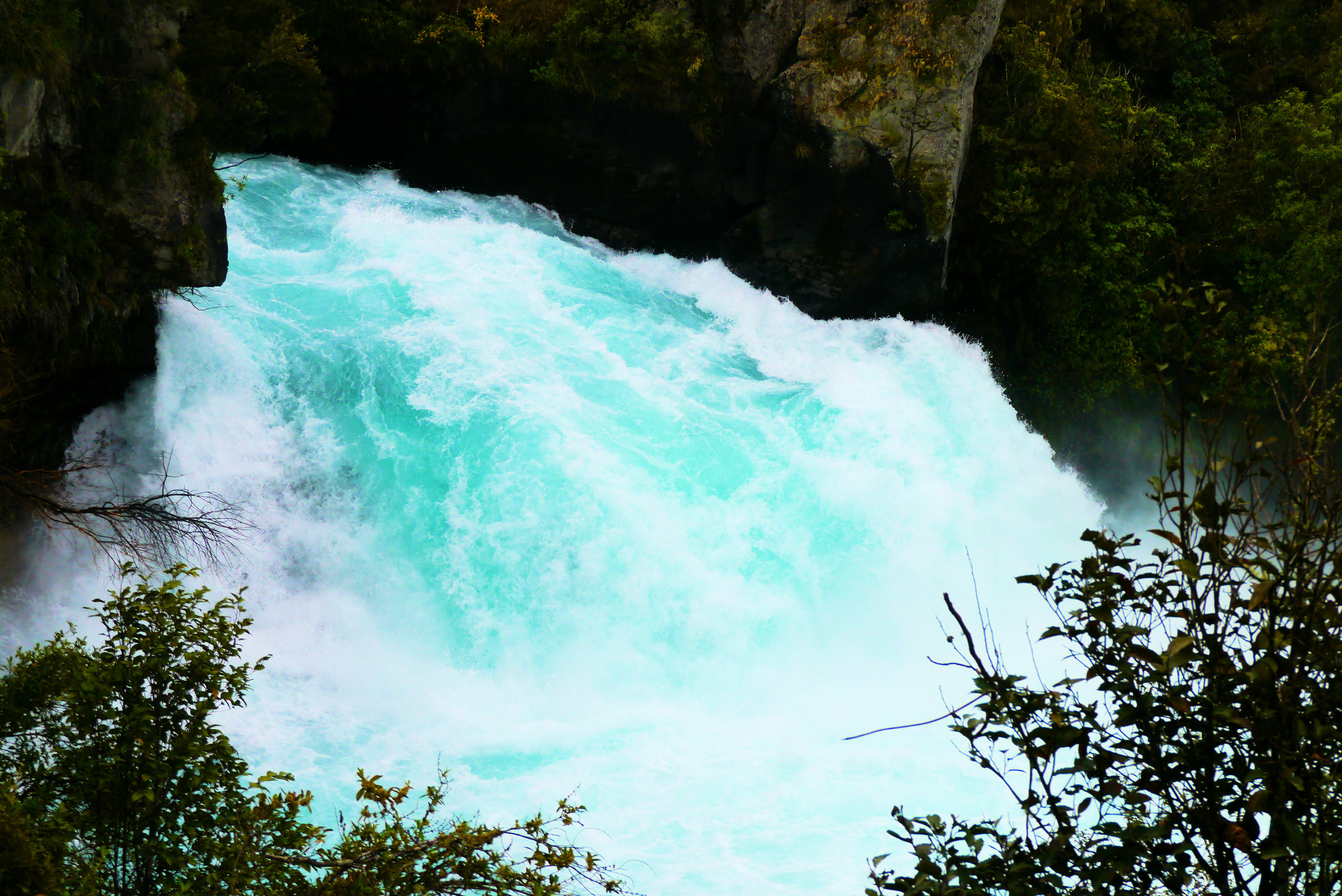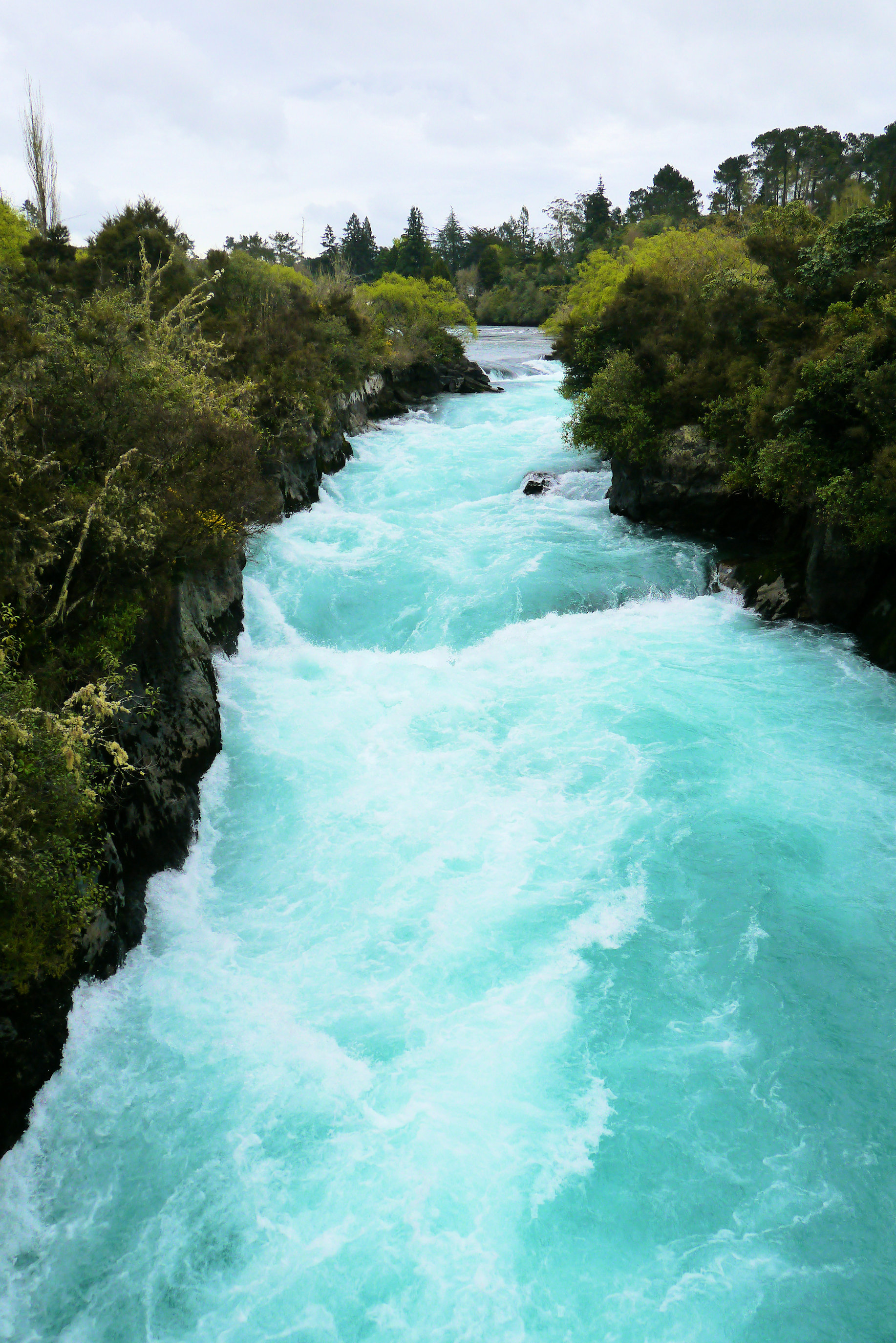 En dit is het dan! De Huka Falls! De Waikato rivier moet hier ineens door een redelijk smalle kloof heen en daardoor krijgt het water een enorme kracht. De betekenis van Huka is schuim. Ik denk dat het wel duidelijk is waar die naam vandaan komt. Het water krijgt er ook een prachtig heldere kleur blauw van.