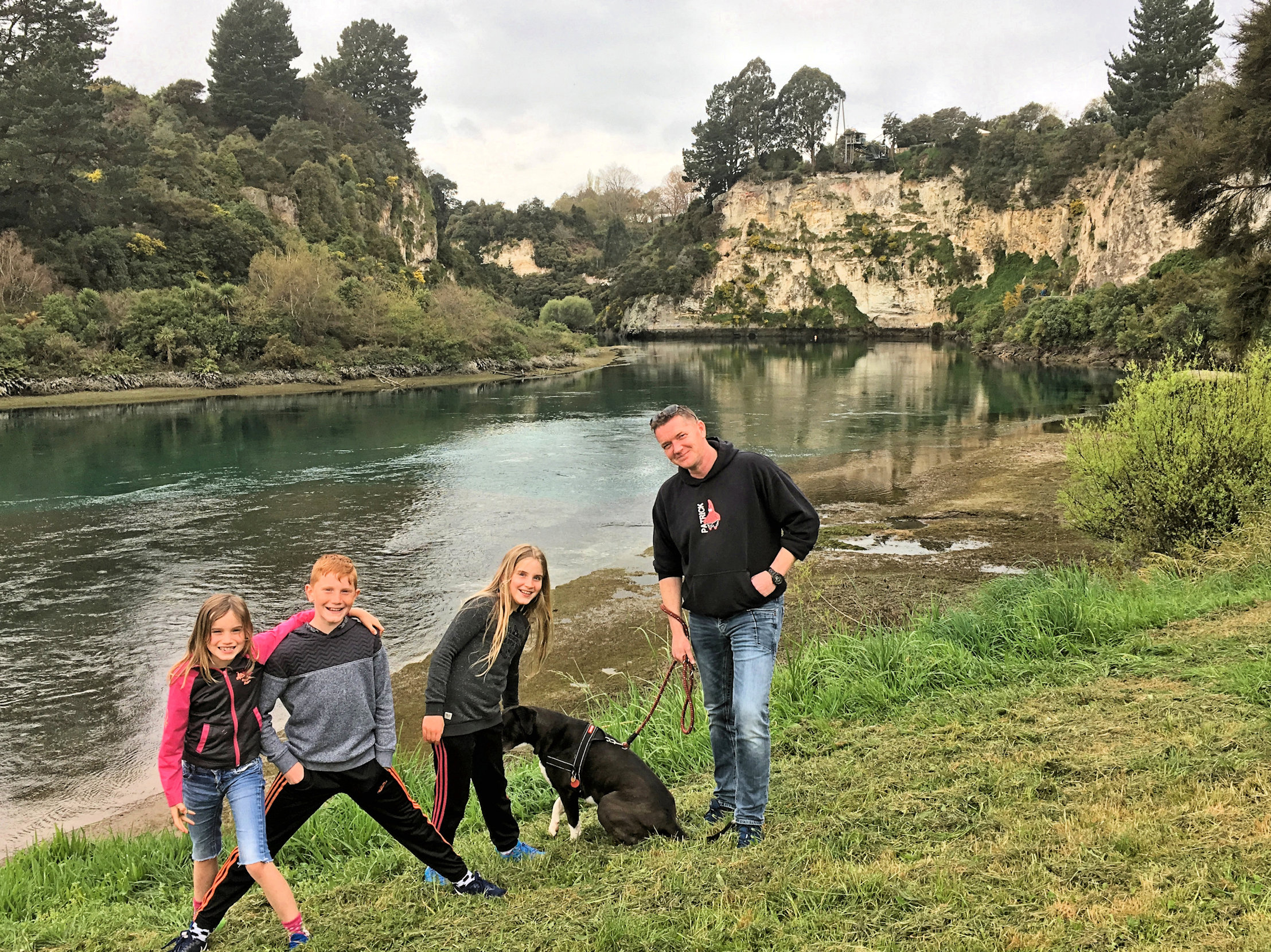 Vanaf ons balkon keken we naar de rivier, de Waikato. Mooi plekje om de hond uit te gaan laten dus. Achter op die grote klif kon je ook bungee jumpen. Wij hebben het niet gedaan, maar we hebben wel een paar andere helden gezien die er vanaf springen.