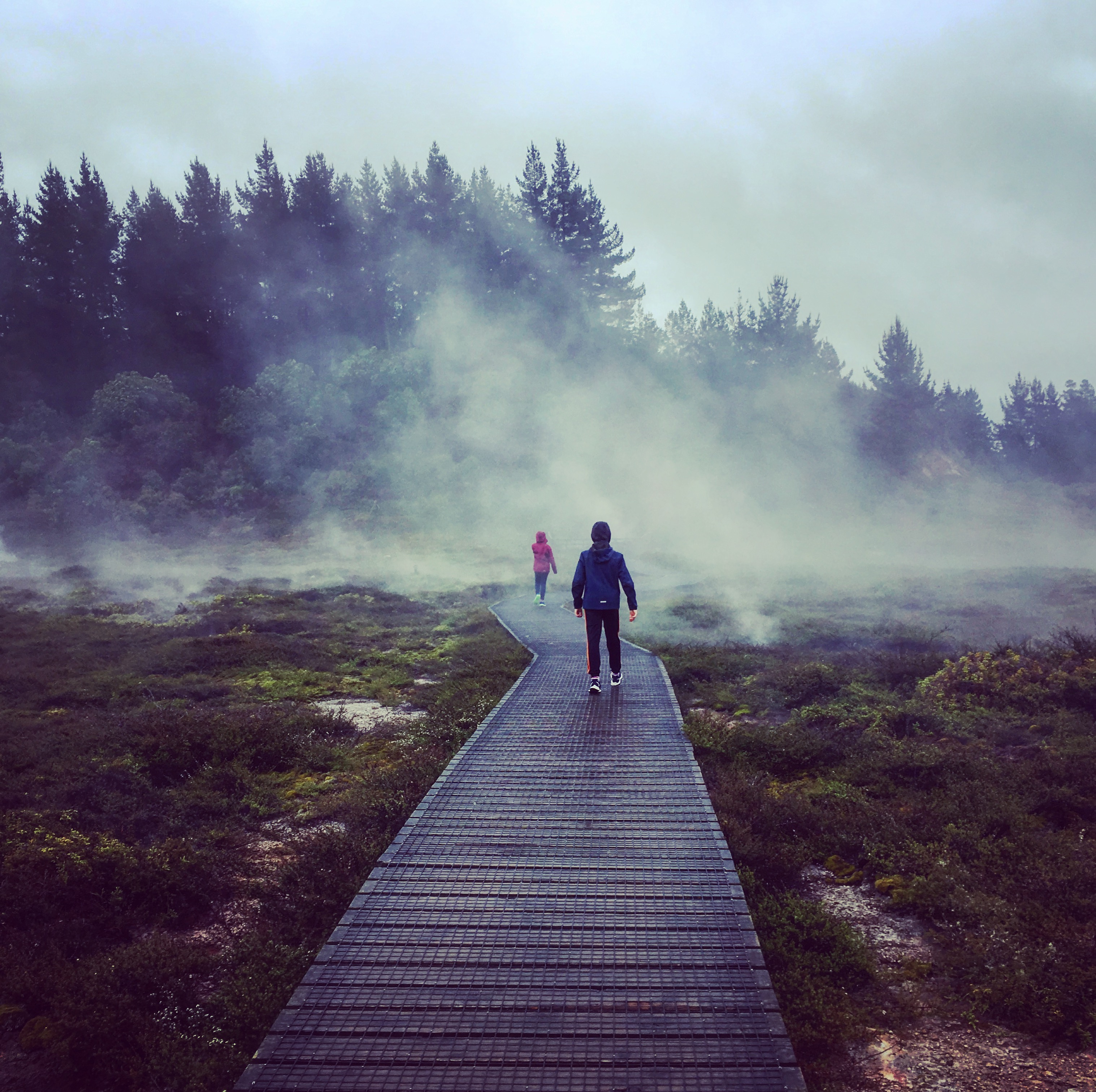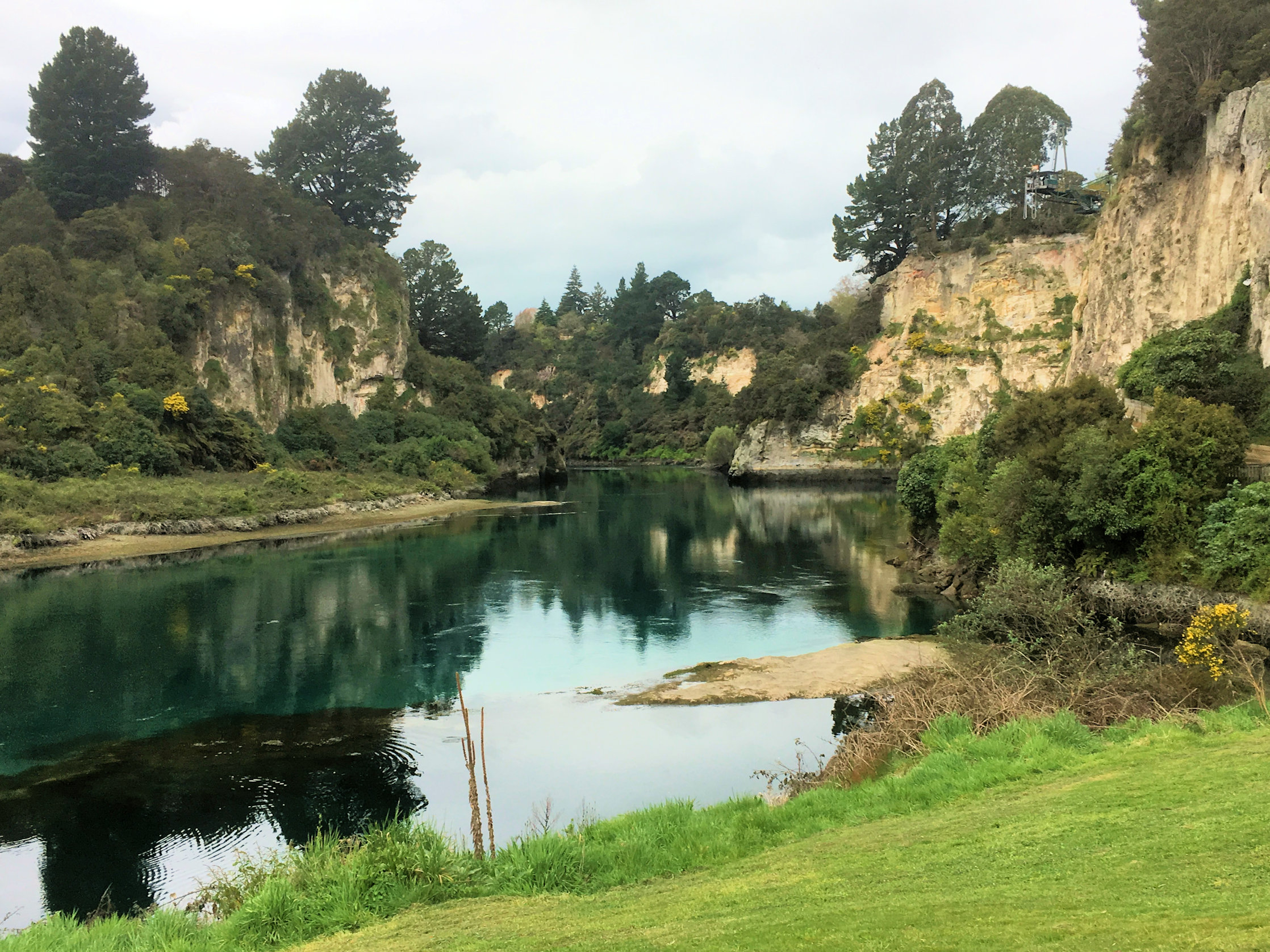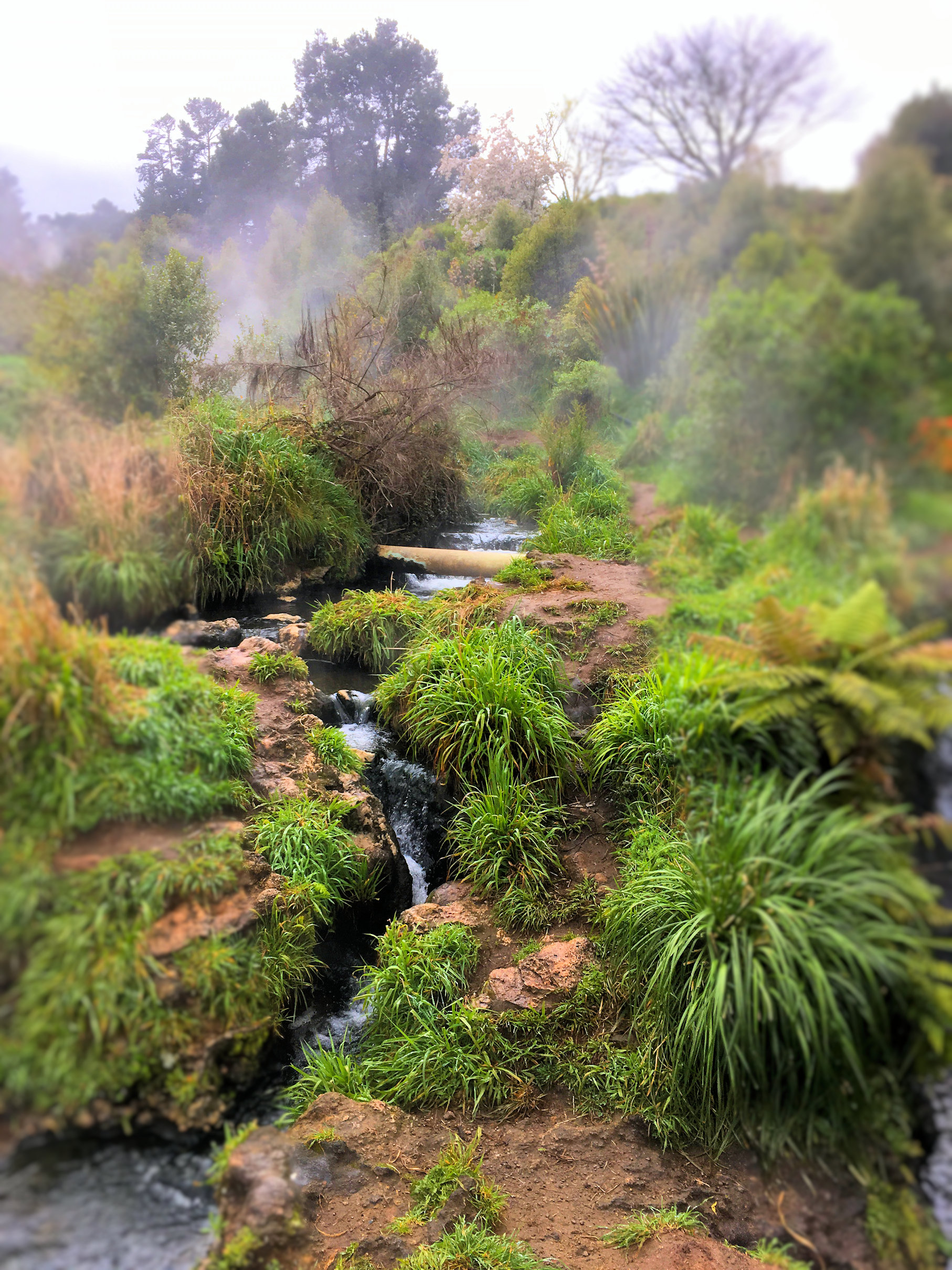 Vanaf ons huisje konden we een wandeling maken naar de Huka Falls. Daarvoor moesten we eerst door het Spa Thermal Park lopen. Je ziet wel waar die naam vandaan komt! Er zitten meer dan genoeg warmtebronnen. Helaas vandaag geen tijd om ze te testen, maar dat doen we later wel.